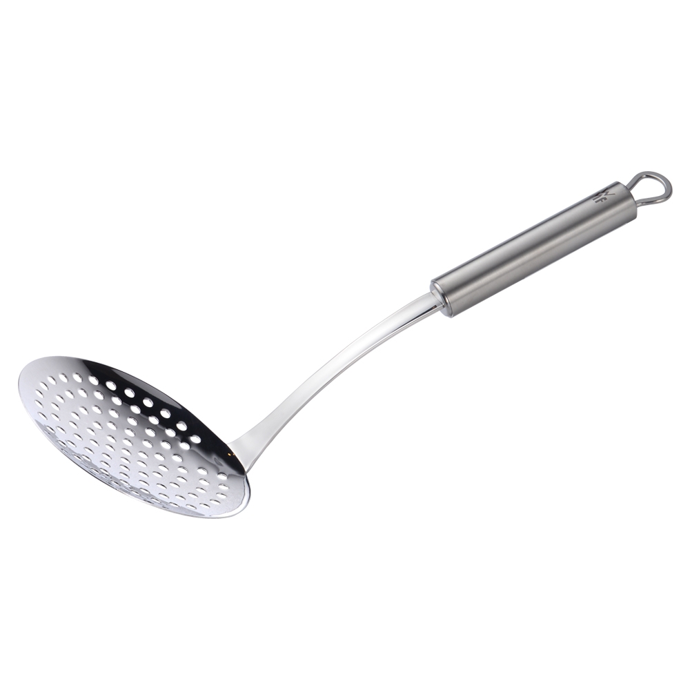 此款撈勺是用Cromargan ® 18/10不鏽鋼(316不鏽鋼)製成,不會留下食物的氣味且更不易被食物的酸性所侵蝕,兼具耐用與安全衛生的特性。勺面為圓形孔洞,孔洞比一般撈勺大,水可輕易流過,適合用來撈水餃及燙青菜等。手柄上有可承重的吊環,方便收納與使用。可放於洗碗機中做清洗。