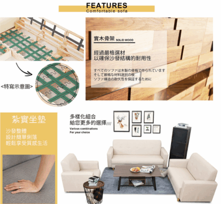 內材:柳安實木骨架+高密度泡棉+聚合綿